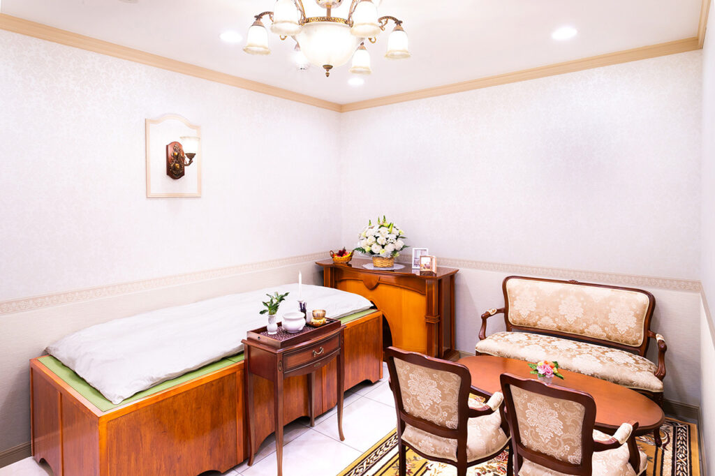 1室あたり十畳ほどのゆったりとした空間に、個別の玄関を設けた部屋を2室ご用意し、各々がホテルのような内装と故人様専用の畳敷きベッドをご用意することで、24時間いつでもご面会が可能です。大切な方とご家族との最後の時間をお過ごしいただけます。